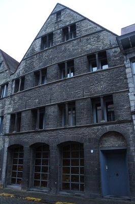La façade en moellons de pierre de Tournai de trois niveaux surmontés d’un pignon sur rue est marquée horizontalement par des bandeaux continus. Le rez-de-chaussée est ouvert de quatre grandes arcades, fruit de restaurations datant de 1880 et de 1970 à 1972. Les étages sont éclairés par deux rangées de baies à colonnettes centrales ornées d’un chapiteau à feuilles stylisées.
