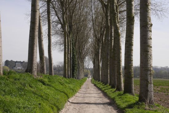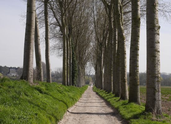 Longue allée en terre bordée de peupliers du Canada offrant une vue dégagée sur la campagne.