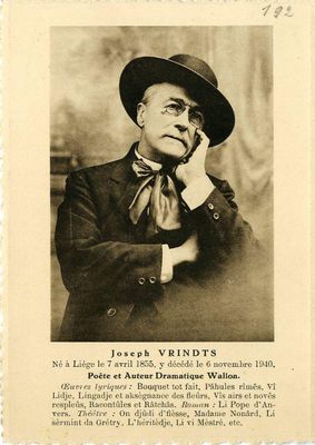 Considéré comme le prince des poètes liégeois, Joseph VRINDTS est né en 1855 rue Gravioule et décédé en 1940, dans sa maison du quai de la Dérivation. Il ouvre en 1902 le café littéraire wallon de la rue Jean D’Outremeuse. Aide bibliothécaire de la bibliothèque des Chiroux, il est en charge du Fonds wallon, ancêtre de l’actuelle Bibliothèque des dialectes de Wallonie. Il a marqué les Liégeois de son temps, et particulièrement le jeune Georges Simenon, autant par ses écrits que par son attitude typique de poète romantique. Pour ses prouesses littéraires dialectales, il fut nommé membre de l’Académie des langue et littérature françaises de Belgique en 1940, quelques mois avant sa mort. Illu : Photo de Joseph Vrindts, vers 1938 (Photo JosephVrindts1)