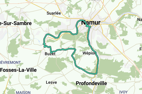 Profondeville à Floreffe via Namur : le long des berges de la Meuse puis de la Sambre. Conseil : passer, même si ça monte un peu, par la citadelle de Namur pour éviter la ville et jouir d'une superbe vue sur la cité namuroise.
