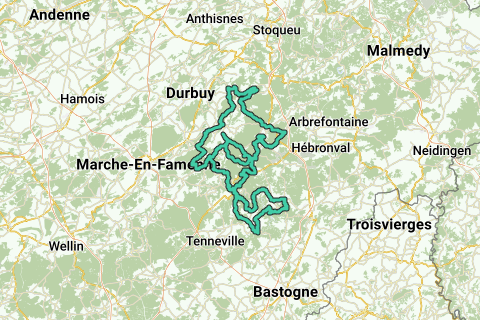 Puisque nous partons maintenant de notre hôtel sportif « Taeru » à Blier, nous passons par la Côte de Marcouray, la Côte de Douaire, la Côte de Cielle (NO) directement à la Côte de Hives à la Roche au lieu de la Côte de Beausant (grande piste) et la Côte de Mierchamps depuis CC. C’est-à-dire que depuis la Côte de Hives est suivie la piste légendaire du « Criquillon ». Il en va de même avec juste en face de la Côte de Beffe, la difficile Côte de Waharday, complétée par quelques montées tranquilles parralel sur les routes nationales d’origine plus fréquentées. Cette belle route super lourde est suivie jusqu’à Dochamps (Lauprangeleux) puis descend jusqu’au point de départ « Taeru » à Blier au lieu de Samreé jusqu’à la Roche... SUR le compteur que 171Km; +- 3600HM; et +-22 pistes!!! Un vrai mordeur de veau!!!