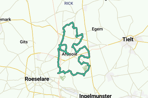 La Veldroute décrit une sorte d'ellipse déformée autour d'Ardooie. En principe, tu peux entrer dans cet itinéraire à n'importe quel endroit, mais pour te faciliter la tâche, il y a une route d'accès bien signalée depuis le centre d'Ardooie qui te mène jusqu'à l'itinéraire principal. Il en va de même pour le retour au point de départ.