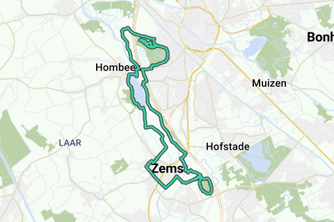 --> Après le passage souterrain sous la ligne de chemin de fer à la Zenne à Hombeek, tu prends le flanc ouest de l'Eglegemvijver (tu suis l'étang à gauche). Au point le plus au sud, tu tournes à droite (attention, tu ne prends pas le Zennedijk). un peu plus loin le deuxième à gauche (via un chemin en pavés qui est partiellement bien asphalté pour la circulation lente). Tu arrives alors à l'OCMW de Zemst, traverses la route et continues ta direction à gauche de l'OCMW, où tu dois tourner à droite après 100 m pour accéder à l'arrière de la maison de repos Releghem. Tourne à droite à la T près de la maison de repos, garde la maison de repos sur ta gauche jusqu'à son entrée. Là, sors et à la T tourne à gauche. Reste dans cette direction (tu passes une chapelle à un rond-point), continue sur la route de Bruxelles et dans la rue sans issue, où tu arries à passer par un chemin vers la Dijk de la réduction de Zenne. Là, prends à gauche. Au premier pont à droite, puis tout droit sous deux ponts de chemin de fer, et ensuite à gauche entre les maisons (avant le troisième pont). À la fin de ce chemin, tourne à droite et à gauche pour retourner au parking de l'étang de poissons. À ton point de départ, tu as complété les 21,1 km.
