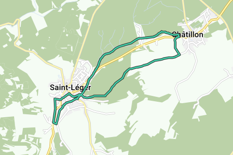 Départ St-Léger rue du Chaufour 2, vers la rue de France, rue de Virton, joindre le complex sportif, le long du lac de conchibois. Vers piste cyclabe par Choupa et rejoindre ancien garage Contant à Châtillon, puis à droite Grand rue et directement à gauche vers le charme, passer devant la ferme Bilocq au pré des fonds. Vers le bois direction Saint-Léger versl a chapelle de Wachet, longer le chemin de croix en pierre de taille. Vers la rue des Oies pour retourner vers le centre du village par la rue des Fabriques et la rue Godfroid Kurth.