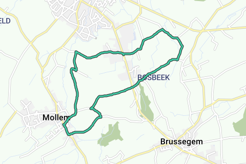 Ici, tourne à droite et continue à suivre le Callariswandelpad. Le chemin redevient un chemin de terre et de gravier. Ici, tu progresses à environ 50 mètres de hauteur avec des vues uniques sur les Kouters brabançons. Au loin, tu vois le hameau de Bosbeek apparaître. Au niveau des cinq chemins, reste tout droit, le long du chemin en béton creux en descendant, jusqu'à ce que tu traverses à nouveau la route Merchtem – Bruxelles. Ainsi, tu quittes le Callariswandelpad et te diriges vers l'Olmenstraat. Bientôt, tu auras à nouveau de belles vues. Suis ce chemin en direction de la ligne haute tension. Lorsque le chemin tourne à gauche, tu atteins le Spanjaardshof, une ferme impressionnante avec plusieurs bâtiments de ferme. Peu après le Spanjaardshof, à hauteur de la Mollemstraat, tourne à gauche. Après quelques virages en montée, tourne à droite, dans le chemin pavé. C'est une partie du sentier de randonnée Grote Molenbeek. Le chemin se transforme rapidement en un chemin de terre. En descendant, tu as une belle vue sur le village de Mollem. De nouveau sur le chemin revêtu, reste à droite (c'est toujours le sentier de randonnée Grote Molenbeek). Suis ce chemin tout droit jusqu'à la fin. Au carrefour, tourne à droite. Continue ton chemin jusqu'à l'église de Mollem.