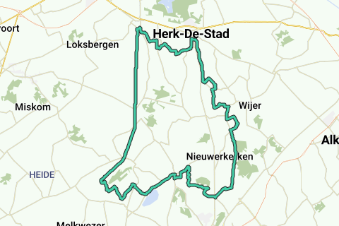 À la prochaine bifurcation, tu es au point de jonction 150. Prends tout droit le chemin pour cyclistes, en direction du 175, légèrement en pente jusqu'à un espace de repos couvert avec une belle vue sur Nieuwerkerken et un panneau d'information. Ensuite, tu dois descendre. Sans pédaler, tu dévales entre les vergers. De nouveau dans le monde habité, à l'intersection, continue tout droit. À la fin de l'espace, tourne à droite dans le chemin sans issue, mais cela n'est bien sûr pas valable pour les cyclistes. Encore entre les vergers et après 4 colonnes en béton, tu arrives au point de jonction 175. Tourne à gauche, en direction du 176. À un étrange « petit chapelle en colonnes », tourne à droite puis tourne à gauche jusqu'à une rue transversale. Traverse et prends la Bleukenstraat. Au point de jonction 176, continue en direction du 194 jusqu'à la T-junction à la Tegelrijstraat. Tourne à droite, ignore le chemin vers Rummen et Herk-de-Stad à gauche, puis tourne à gauche dans la Terbermenweg. À la T-junction, tourne à gauche puis à droite dans la Dennenbosstraat. Tu arrives à la Smoldersstraat et la suis à droite à travers un quartier résidentiel. La route s'élargit et tu passes le panneau de Rummen, jusqu'à pouvoir tourner à droite dans la Schopstraat dans le virage, avec à gauche la chapelle de O.-L.-V. de Troost (1872). Ensuite, choisis à gauche Schopstraat 20-22 et continues entre les vergers. Ignore le Klein-Grootveldweg à droite, traverse un ruisseau et tourne à gauche à la T-junction avec à droite des serres. Tu reviens dans la Smoldersstraat et la suis à droite jusqu'à pouvoir entrer à droite dans la Jodestraat. Où la Jodestraat tourne à gauche, tu continues tout droit dans la Sleersenveldweg, un chemin étroit pour cyclistes. À la fin, traverse la Petite Rue Transversale et arrives au point de jonction 194. Continue tout droit, en direction du 195. À la T-junction, tourne à gauche jusqu'au rond-point avec le point de jonction 195. Prends la deuxième sortie, en direction du 353. Ensuite, tourne à gauche dans la Pikkeleerstraat et continues jusqu'au point de départ.