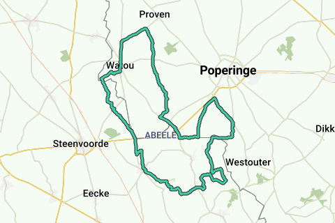 Ignore la Eendepoelstraat à gauche et tourne à gauche à la jonction 11 dans la Paardeblikstraat, en direction de 88. Tu passes à travers un petit bois et continues à serpentiner à travers le paysage ouvert. À la fin de la rue, tourne à droite et à l'intersection en T près du Bistro De Hertog, tourne à gauche. Là où la Poperingestraat tourne à droite, près de 't Hof van Brabant, prends légèrement à gauche la Lenestraat. Ça continue en ondulant à travers le paysage ouvert jusqu'à l'intersection avec le nœud 88 au Estaminet In de Leene. Tourne à gauche, en direction de 87. Tu te diriges maintenant vers Boeschepe par le Boeschepseweg. À droite à l'arrière-plan, tu vois des champs de houblon. Tu passes devant le cimetière britannique de Lijssenthoek, avec un centre de visiteurs gratuit, ignores toutes les routes secondaires et tournes à droite à l'intersection avec 'Den Grooten Onzen Here' et le nœud 87, en direction de 84. Tu te rapproches à nouveau un peu de la frontière et tournes à la halte obligatoire entre une chapelle et une maison datant de 1890 à droite. Suis la D10 à droite et traverse la circulation sur la D948. Continue de l'autre côté par l'Abelestationstraat, traverse le Vleterbeek et roule jusqu'au centre d'Abele. À la petite intersection avec le Kommiezenkot et le musée des douanes, continue tout droit à travers le Trappistenweg.