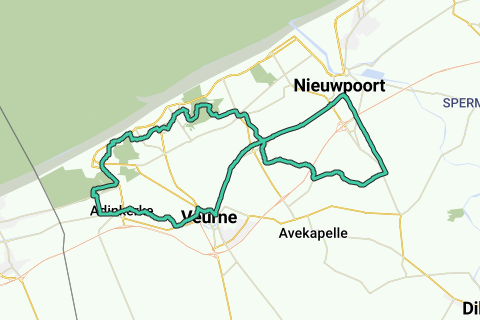 Suivez maintenant la Frontzate à gauche en direction du point de connexion 7. Vous traversez le Kleine Beverdijk et continuez à suivre l'ancienne ligne de chemin de fer tout droit en direction de Nieuwpoort. En route, vous rencontrerez de nombreux bunkers et (restaurés) souvenirs de guerre. À Ramskapelle se trouvent les restes de la gare 4, qui a servi de tour d'observation pendant la Première Guerre mondiale. Une plaque commémorative rappelle les combats sanglants qui s'y sont déroulés. Trois statues de soldats évoquent la paix de Noël de 1914. Continuez à suivre la Frontzate, en passant sous l'autoroute et le long du Koolhofput, le réservoir de la Koolhofvaart. Traversez le canal Nieuwpoort-Dunkerque et vous êtes au point de connexion 7. Suivez le canal à gauche en direction de 6. Vous passerez sous la passerelle Pelikaan en tournant et un peu plus loin sous le pont des tentes. Continuez vers Veurne entre le canal Nieuwpoort-Dunkerque et le Langgeleed (communément appelé Lange Lis), un canal de drainage qui se jette dans l'IJzerhaven à Nieuwpoort. Au point de connexion 6 à Wulpen, tournez à droite vers 66, à travers les polders. À 66, dans le centre de Oostduinkerke, tournez à gauche, vers 65, devant l'hôtel Beau Site, dans la Guldenzandstraat. Retour vers la côte Tournez à droite à l'école d'équitation Ter Duinen, entrez dans les dunes, en serpentant et en ondulant, jusqu'à ce que vous puissiez tourner à gauche dans la réserve naturelle Doornpanne. Vous en sortez et commencez une longue route. Faites bien attention à la signalisation, car il y a beaucoup de virages et de tournants dans un enchevêtrement de routes. À un croisement, vous atteignez le point de connexion 65. Tournez là en direction de 1, sur une route animée sans piste cyclable. Depuis la place de l'église à Koksijde-aan-Zee, avec l'impressionnante église O.-L.-Vrouwter-Duinenkerk, suivez brièvement un chemin cyclable en planches. Tournez dans un chemin étroit, loin de la route animée. Vous passez devant le musée de l'abbaye Ten Duinen 1138 5 jusqu'à la large Koninklijke Prinslaan, avec à gauche un rond-point et le Zuidabdijmolen. Tournez à droite puis à la première rue à gauche. Continuez à travers le centre de Sint-Idesbald et passez devant le musée Paul Delvaux jusqu'à la route animée Koninklijke Baan. Tournez à gauche sur la piste cyclable. Là où la Koninklijke Baan se transforme en Nieuwpoortlaan, prenez le chemin non pavé pour une belle vue sur les Houtsaegerduinen. Vous revenez sur la route pavée et arrivez à la périphérie de De Panne. Vous devez tourner à gauche dans la Koninginnelaan, mais si vous voulez voir la mer, vous devez traverser à droite la Nieuwpoortlaan et aller jusqu'à la promenade. Le dernier tronçon traverse le centre de De Panne pour revenir au point de départ.