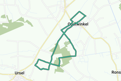 2. Tu progresses maintenant par un large chemin de campagne entre les champs en direction du Keigatbos. La forêt est une avancée du grand Drongengoedbos. Le nom Keigat fait référence à un endroit boisé et à une crête où l'on peut trouver de nombreux galets et pierres. Au bifurcation, tu te tiens à gauche et t'enfonces un peu plus dans la forêt. À la fin du large chemin forestier, tu arrives au Veldkruis ? à Ursel. La croix est entourée de tilleuls et son histoire remonte au 13ème siècle, lorsque l'évêque doornik Walter de Marvis a défini les limites de la paroisse dans cette région. En été, les personnes âgées des environs se réunissent régulièrement ici, c'est pourquoi cet endroit est aussi appelé « parlement des agriculteurs ». Va à gauche jusqu'au carrefour. Suis ici la Keigatstraat à droite, jusqu'à ce que tu puisses entrer à gauche dans un chemin de campagne pour le trafic local. À une ferme, le chemin est de nouveau revêtu. Nous avions en tête un joli détour ici, mais cela ne s'est pas fait, car il passait par un chemin privé. Alors nous tournons à gauche, vers le Konijntje pour le trafic local. La petite route doit son nom à une auberge qui y était exploité au 18ème et 19ème siècle. Du Konijntje, tu as une belle vue sur l'église d'Ursel. Tu te frayes un chemin entre quelques propriétés pittoresques. À un bâtiment annexe d'une petite ferme ?, tu peux lire le poème « Amitié » de Sam Stofferis, un poète d'Ursel. À la fin du chemin étroit en béton, tu tournes à gauche et suives la Veldkruisstraat à gauche jusqu'au premier carrefour. Tu étais déjà ici tout à l'heure. Suis maintenant la Keigatstraat à droite. Le paysage est légèrement vallonné ici. Tu passes sur la Cuesta Zomergem-Oedelem, une crête légèrement ondulée entre Bruges et Gand. Les petites vagues étaient probablement autrefois des bancs de sable, lorsque la mer se trouvait ici. En quelque sorte, les Ardennes flamandes ou le pays vallonné en version miniature. Tu retournes à la forêt et là où le chemin étroit en béton tourne à droite, tu prends à gauche le chemin forestier non goudronné. Continue le long du bord de la forêt jusqu'au carrefour en T de chemins non goudronnés. Tourne à droite et continues à travers le Keibos jusqu'au virage d'un chemin en béton. Suis Diepenbeek tout droit et prends ensuite la première rue à gauche. Tu traverses maintenant la Sint-Jansstraat, nommée d'après l'hôpital Sint-Jans à Bruges, qui possédait autrefois ces terres. À droite, tu as une belle vue sur l'église et le centre du village d'Oostwinkel.