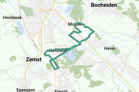 Le départ de la boucle de 16,09 km se situe à l'intersection de l'Ambroossteenweg (église de Hofstade) avec la Zusterstraat (à 50 m au nord-est de l'église). Nous prenons le chemin le plus court vers le croisement du 8 (direction est, puis suivre la ligne de chemin de fer 27B et la passer sous, puis à gauche le long de Prinsenveld jusqu'au pont Vaart de la ligne de chemin de fer 27B. À la partie sud-est du pont, grimpez le chemin de la berge, après quoi un sentier piéton séparé vous amène à la rive droite. Un chemin a été aménagé au-dessus du pont qui descend vers la berge (avec garde-corps). Ensuite, retournez au canal et suivez à droite sous le pont la rive droite vers le nord jusqu'après le parc animalier de Planckendael et le siphon de la Barebeek sous le canal, où nous descendons (raide et étroit) sur la berge du canal à droite en direction du centre de Muizen. Sur la Leuvensesteenweg, nous suivons donc la Barebeek 2x sous la ligne de chemin de fer, puis prenons à gauche et suivons la ligne de chemin de fer vers le nord en direction de Mechelen. Aux racks à vélo de la gare de Muizen, nous tournons à droite et arrivons au village de Muizen. Là, nous descendons le Dijleberg et atteignons la Dijle, que nous suivons à droite (en amont). Attention à la circulation automobile au pont de Muizen sur la Dijle. Un peu plus loin, vous passez au-dessus de l'embouchure de la Barebeek dans la Dijle (avec une vue féerique sur le paysage). Un peu plus loin, vous atteignez un embranchement à droite juste avant un grand étang à poisson. Suivez-le jusqu'à la fin, après quoi vous arrivez directement à gauche et à droite sur un chemin qui vous fait passer 2x au-dessus d'une ligne de chemin de fer (chemin pavé). Au Leuvensesteenweg, vous devez marcher 50 m à droite pour prendre la Prinsenveldstraat à gauche le long de la ligne de chemin de fer 27B, et revenir au croisement du 8.