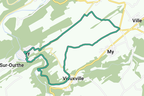 Au départ du Domaine de Palogne, prenez la passerelle vers le ravel le long de l'Ourthe, suivez le courant vers le village de Sy, traversez ensuite le pont du chemin de fer et tournez à droite pour monter sur les hauteurs du village. Un petit chemin à gauche permet de rejoindre la route de Filot, que vous suivez pendant environ 2 kilomètres avant de tourner à droite, à gauche puis à droite pour rejoindre le sommet de la crète au petits avions. Redescendez sur la petite route et à la ferme, tournez à droite sur le chemin à travers champs. Arrivez à la route et redescendez via le Thier de Logne pour revenir au Domaine de Palogne.