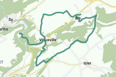 Au départ du Domaine de Palogne, suivez les triangles verts. Prenez la direction Vieuxville, au Y montez à gauche vers le Thier de Logne. Continuez à grimper jusqu'à arriver sur un chemin de campagne le long d'une zone de pique nique. Continuez sur le chemin jusqu'au sommet et tournez à droite. Un grand arbre seul se découpe à l'horizon. Arrivez à cet arbre, tournez à gauche puis au premier chemin sur la droite, plongez dans les bois. Vous arrivez dans le village de My qui fait partie des plus beaux villages de Wallonie. Continuez sur la gauche puis passer sous la grand route en prenant les escalier. Traversez le village sous le vieux tilleul. Continuez à travers champs vers le moulin à huile. Ensuite ça grimpe sur la route vers Izier. Au sommet prenez à droite sur le chemin de campagne et continuez tout droit pendant quelques kilomètres. Ensuite ça tourne à gauche et à droite vers la chapelle Saint Rahi. On redescend vers Vieuxville et la ferme de la Bouverie et retour vers le Domaine de Palogne.