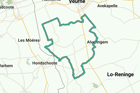 Vous roulez entre quelques vergers. À un embranchement, gardez la droite et passez devant ’t Bloesemhof, un magasin de légumes et de fruits. Un peu plus loin, vous arrivez au nœud 53 avec un ancien panneau indicatif. RD en direction du nœud 88, Hoogstade et Alveringem. ● Vous arrivez à la N8 et la traversez prudemment en RD. À droite, vous apercevez l'église de Hoogstade. Continuez dans la Burgmolenstraat jusqu'au nœud 88. Continuez à rouler en RD jusqu'au nœud 90, 400 m plus loin. ● Encore une fois RD, en direction du nœud 45. À l'embranchement avec la chapelle de 1851, gardez LA. Ensuite, prenez la première route à droite. Celle-ci mène à un chemin réservé aux cyclistes, piétons et cavaliers. Après un virage gauche-droite, vous roulez à côté de quelques maisons et la route est à nouveau accessible à toute circulation. Au carrefour en T, allez à gauche jusqu'à la route prioritaire au nœud 45. RA en direction du nœud 43. ● Vous passez devant le panneau d'agglomération d'Alveringem et le Hof van Wyckhuize, maintenant la mairie. Prenez le temps de passer par le portail d'entrée. À l'intérieur, vous trouverez quelques photos de la Première Guerre mondiale, autour d'une petite place. Juste après, vous êtes au nœud 43. LA en direction du nœud 63. Au carrefour en T, RA, à gauche c'est une impasse. À droite, vous aurez une belle vue sur l'église d'Alveringem.