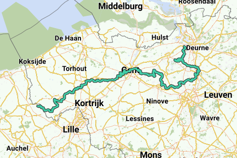 Martinusroute via Beveren, Zwijndrecht, Termonde, Alost, Gand, Rousselare, Ypres, Boeschepe via le GR12, GR 5a, GR 128, GR 5a