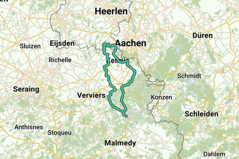 Aller-retour Voerstreek 9 depuis Vijlen. Départ/arrivée: boscafé 't Hijgend Hert, Rugweg, Vijlen. Ascensions : Col de Wolfhaag Vaals 1 900 m., max. 10,0%. Vennkreuz Neudorf (W) 3.000 m., max. 8.0%. Baraque Michel d’Eupen (B) 13.900 m., max. 8,0%. Rue Vreuschemen Membach (B) 1.800 m., max. 8,0%. Cottessen/Camerig ouest Files 4.600 m., max. 8,0%. Dans la voie aussi plusieurs montées sans nom. Altimètres: 1 291. Arrêt café: restaurant au sommet Baraque Michel Jalhay (B) (lun/mar fermé).