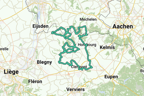 Aller-retour Voerstreek 25 depuis Slenaken. Départ/arrivée : grand parking pied Loorberg Slenaken. Dénivelé: Grensweg Slenaken 400 m., max. 10.0%. Gieveldstraat Teuven (B) 1.500 m., max. 6.0%. Epen Smidsberg 1 500 m., max. 7,0%. Rue de Beusdael (partiellement) Sippenaeken (B) 1.700 m., max. 8.0%. Rue de la Station Hombourgh (W) 700 m., max. 15,0%. Rue de Remersdael Hombourgh (W) 4.500 m., max. 5,0%. Conseil Auweg (W) 1.400 m., max. 7.0%. Cour la Saulx (en partie) Lohirville (W) 1.300 m., max. 5.0%. Fastré (partiellement) Renouprez (B) 400 m., max. 6.0%. Bebronne Charneux (O) 600 m.max. 10.0%. Côte de Hagelstein Aubel (B) 1.100 m., max. 6,0%. Zwaen/Brabant/Rullen St. Pieters-Voeren (W) 1.000 m., max. 14,0%. Côte de Gaet St Jean-Sart (B) 900 m., max. 6.0%. Rue de Merckhof (partiellement) Aubel (B) 1.600 m., max. 5.0%. Altenbroek Voeren (B) 2.100 m., max. 9,0%. Vroelen Noorbeek 2.000 m., max. 7,0%. Krindaal/de Planck Veurs (W) 1.600 m., max. 10,0%. Dans la voie aussi plusieurs montées sans nom. Altimètres: 1 419. Arrêt café: Les élevages du Moulin du Val Dieu, Val Dieu 298, Aubel (B) (Lun/Mar fermé) ou restaurant de l’Abbaye du Val-Dieu, Val-Dieu 227, Aubel (B) (mois d’été Mar fermé / en hiver également Lun fermé).