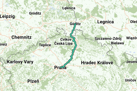 Itinéraire de pèlerinage pour vélos de course entre Görlitz et Praha. Les villes suivantes se trouvent sur le chemin : Görlitz, Zittau, Mlada Boleslav et Praha.