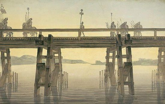 Pendant la guerre des Gaules, les troupes romaines devaient faire face à des raids de Germains dans les nouveaux territoires conquis, qui se repliaient ensuite au-delà du Rhin. César souhaitait les effrayer et apporter son soutien aux Ubiens, une tribu germanique alliée de Rome, en montrant la capacité des légions romaines à se transporter rapidement au delà du fleuve. Considérant les bateaux comme peu sûrs, et indignes des romains, il fit construire un pont, achevé 10 jours après qu'on eut commencé à apporter les matériaux. Il fut détruit par les Romains lors de leur retour sur la rive occidentale du fleuve, 18 jours plus tard. Un second pont sera construit deux ans plus tard pour un second passage en Germanie des troupes romaines et détruit après leur retour. César décrit leur construction dans ses Commentaires sur la Guerre des Gaules. Ces ponts sont considérés comme des chef-d'œuvre d'ingénierie militaire. On ignore leur localisation exacte, les environs de l'actuelle ville de Neuwied, 15 km au nord de Coblence, étant les plus souvent cités. Camille Jullian propose Cologne comme lieu le plus probable.