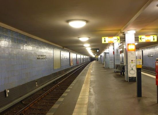 La station a été mise en service le 18 avril 1930 et a été entre le 13 août 1961 et le 1er juillet 1990 mise hors service du fait de la partition de Berlin. Le quai central fait 8 mètre de large et les murs sont dallés bleu gris.