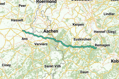 Le reste du parcours monte et descend à travers les montagnes de l'Eifel allemandes avec leur nature magnifique. En Allemagne, nous traversons d'abord une partie de l'État de la Rhénanie-du-Nord-Westphalie et arrivons à 139 km dans le Land de Rhénanie-Palatinat.