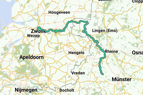 La route de Vechtetal est une piste cyclable transfrontalière qui suit le cours de la Vechte sur une distance de 223 km, depuis sa source à Darfeld, dans le Münsterland, jusqu'à sa confluence dans la ville commerçante historique de Zwolle aux Pays-Bas. À partir de Nordhorn, la route suit la route des kunstwegen en parallèle. Sur le chemin de la source à l'embouchure dans le « Zwarte Water », vous serez accompagné par un paysage naturel varié avec de nombreux canaux, forêts et champs. Au total, 15 villes et communes différentes sont reliées ici des deux côtés, allemand et néerlandais, par la route de Vechtetal.