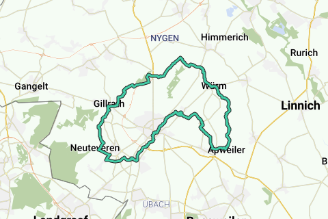 Description : Une boucle détendue et variée dans le pays de Geilenkirchen, principalement sur des chemins agricoles asphaltés. Le revêtement est rarement rugueux, les passages de sentiers de terre représentent même moins de 15 % du parcours. Nous traversons plusieurs villages paisibles et sommes par ailleurs principalement dans des paysages de champs et de prairies également tranquilles. Le profil est légèrement vallonné. La seule montée significative mène brièvement hors de la vallée de Wurm après KP 63.