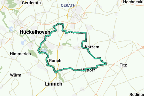 Tour presque complètement plate à travers la région de Linnich/Erkelenz. De nombreux petits villages tranquilles sont traversés. La plupart du temps, le parcours se fait sur des chemins de terre asphaltés, la portion en gravier étant d'environ 5 km. Il y a peu de sections courtes sur des routes de circulation. Le paysage est marqué par l'agriculture, mais il y a aussi des morceaux de forêt et des espaces verts. À la fin, une magnifique section attend dans la vallée fluviale de la Rur.