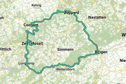 De là, nous continuons vers le nord le long de la Moselle et passons par Traben-Trarbach ; Cochem ; Treis-Karden, et nous terminons notre trajet à Moselkern.