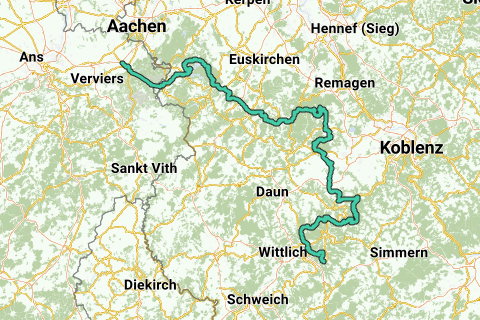 Le parcours commence à Traben-Trarbach sur la Moselle et se termine à Eupen (A3/E40 Rampe 38).