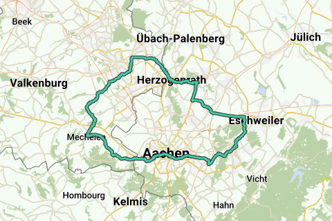 Cet itinéraire commence et se termine à : 13 Münsterplatz, 52062 Burtscheid. Pente moyenne : 0,89 %. L'itinéraire passe par les points d'intérêt suivants : Cathédrale d'Aix-la-Chapelle, Château de Vaalsbroek (château), Vignoble de Wittemer Wahlwiller (brasserie), Miljoenenlijn (chemin de fer).