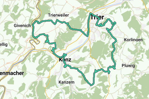 Piste cyclable pour vélo de course ou VTT de Langsur (Messenich) à Trèves et Konz. Vous pédalez par-dessus quelques pentes à travers des forêts, des vignobles et des champs le long du chemin. En tout, vous parcourez 65 km avec de nombreux dénivelés.