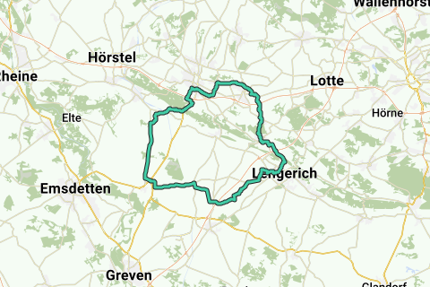 Allez en reconnaissance à Tecklenburg et découvrez les plus jolies routes et pistes cyclables. Ceux qui ont un vélo de course seraient contents, car cet itinéraire est complètement revêtu. Les fans de cyclisme ne prennent probablement pas ces pentes au sérieux, mais pour le cycliste 'moyen' ils sont quand même difficiles. Il y a peu de chances que vous croisiez beaucoup de voiture le long de cet itinéraire.
