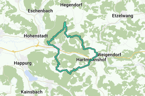 Une route vallonnée à travers Pommelsbrunn. Cette randonnée n'est certainement pas plane partout. Peu de chances que vous voyiez beaucoup de voitures le long de cette route. Si les dieux du temps sont de bonne humeur, c'est une belle randonnée. Un site le long de cette route que vous devez absolument voir : le Burgstall Hartmannshof.