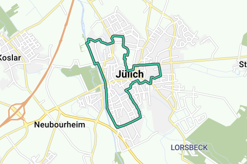 Enchanté de faire votre connaissance, Jülich. Peu de chances que vous voyiez beaucoup de voitures le long de cet itinéraire. Ce chemin passe par des routes non pavées. Par temps sec, elles sont en excellent état. Profitez au carré ! N'hésitez pas à admirer les sites le long de cet itinéraire (y compris la citadelle de Jülich).