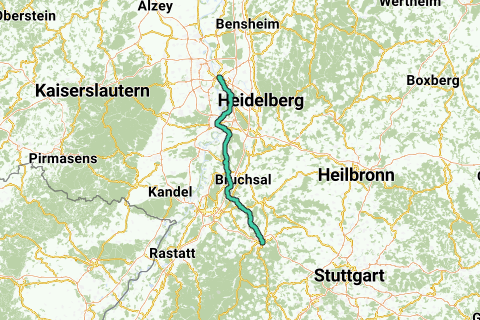 Cet itinéraire n'est certainement pas la version exacte de la trajectoire historique de Mme Bertha. Mais cet itinéraire privilégie plutôt les belles routes que les routes rapides, afin que vous puissiez profiter pleinement du paysage entre Mannheim et Pforzheim.