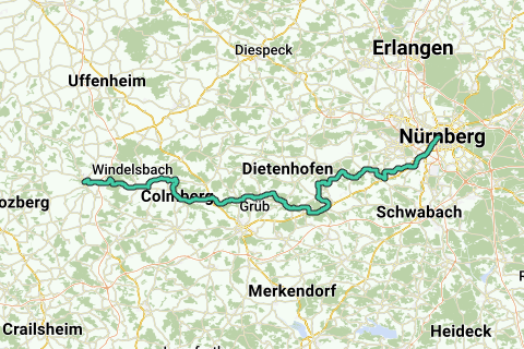 Itinéraire de pèlerinage pour vélos de course entre Nuremberg et Rothenburg. Les villes suivantes se trouvent sur l'itinéraire : Nuremberg et Rothenburg.