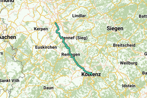 Itinéraire de pèlerinage pour vélos de route entre Cologne et Coblence. Les villes suivantes se trouvent sur la route : Cologne, Bonn, Andernach et Coblence.