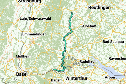 Route de pèlerinage pour VTT entre Horb am Neckar et Waldshut. Les villes suivantes se trouvent sur l'itinéraire : Horb am Neckar, Rottweil, Donaueschingen, Waldshut.