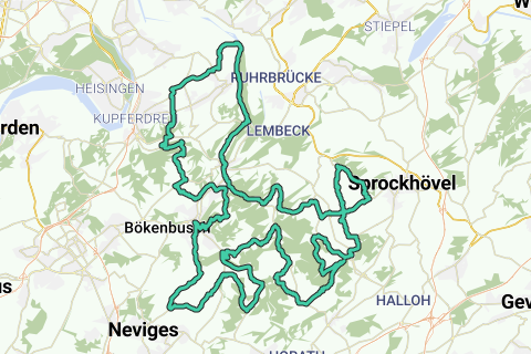 Le Hügelland de Hattingen (ou la Suisse d'Elfringhausen) est une région d'environ 15 x 15 kilomètres entre Essen et Wuppertal. Le contraste avec la zone urbaine environnante est marqué : vous y trouverez un paysage très vallonné avec des arbres feuillus et des prairies, des maisons à colombages, diverses fermes (fermes) en partie avec une fonction de restauration et l'équitation (écuries, boxes) est bien représentée ici. C'est donc aussi un endroit populaire pour les citadins des environs (pour la randonnée, le VTT ou le cyclisme), de sorte qu'il peut y avoir foule ici les dimanches et jours fériés. Par exemple, vous devriez absolument éviter la K33 (Wodantal) (trop fréquentée). Néanmoins, vous trouverez encore dans cette petite région de nombreuses routes calmes, souvent fermées à la circulation (sauf pour les résidents). Pour faire le parcours un peu plus long que 50 à 60 km, vous devez vous diriger vers des zones environnantes qui sont souvent urbanisées ou où il y a beaucoup de routes de transit fréquentées. Le chemin de fer le long de la Ruhr (sur cet itinéraire) et la ligne ferroviaire transformée en piste cyclable entre Wuppertal et Hattingen offrent cependant de bonnes possibilités pour étendre le parcours par des routes peu ou pas fréquentées.