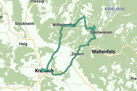 Le départ de cette piste cyclable se termine à la gare de la confortable Kronach avec sa vieille ville, où la forteresse de Rosenberg est l'attraction principale. L'itinéraire se poursuit le long de la beauté naturelle, omniprésente sous forme de vallées, de forêts et de collines.
