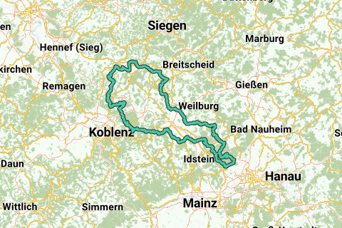 De Kroppach, nous prenons la direction du sud vers Puderbach dans le Taunus. La plus haute montagne du Taunus est le Großer Feldberg, qui culmine à 881,5 mètres. D'autres sommets élevés incluent le Kleine Feldberg (825 m) et l'Altkönig, qui mesure 798 mètres. Nous passons par le Großer Feldberg pour aller au château en ruine de Königstein, puis le long de l'Altkönig en direction de Bad Marienberg, où se trouve près des montagnes le Fuchskauten, qui s'élève à 656 mètres. C'est la montagne la plus haute du Westerwald. Sur le chemin, nous passons également par une belle tour de guet près de Bad Marienberg. Encore un court trajet et nous sommes de retour à Kroppach.