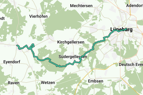 Le point de départ de l'itinéraire reste bien entendu à Lüneburg à la gare et se poursuit par le chemin familier à travers la ville jusqu'au domaine de Schnellenberg ; nous nous dirigеons vers Südgellersen, ce qui permet de découvrir de magnifiques paysages. Le nouveau chemin longe maintenant le ruisseau de Hasenburger Mühlenbach jusqu'à Heiligenthal, Deppental, à travers la forêt de monastère de Gellersen jusqu'à la zone protégée de Röndahl. Ceux qui apprécient l'équitation se réjouiront particulièrement des prairies avec les chevaux de sport élégants lors de la traversée des paddocks à Luhmühlen. Après le changement de parc, on arrive le long de la nouvelle baignade forestière à Salzhausen, où l'on est également bien servi à l auberge Rüters ("Wilde 13" disponible) , juste derrière se trouve la gare routière.