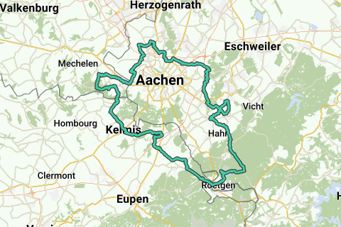Aller-retour vers Aix-la-Chapelle 1 depuis Vijlen. Départ/Arrivée : boscafé 't Hijgend Hert, Rugweg, Vijlen. Montées : Slangenweg Seffent (D) 900 m., max. 9,0 %. Waldsiedlung Mulartshütte (D) 6.900 m., max. 14,0 %. Rue de Vaals Gemmenich (B) 1.100 m., max. 9,0 %. Camerig est Vaals 2.800 m., max. 12,0 %. Altimètre : 1.216. Pause café : Restaurant Birkenhof, Mulartshütterstraße 20, Stolberg/Venwegen (D) (Horaires d'ouverture à suivre).