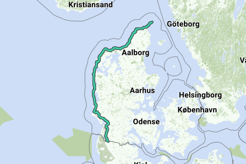 La route à vélo de la mer du Nord (localement : Vestkystruten, N1) part de Rudbøl en direction de Skagen et traverse certaines des plus grandes expériences naturistes au Danemark. Environ un tiers des 560 km de distance est constitué de chemins de gravier, que vous pouvez mieux parcourir avec des pneus larges. Il n’y a pas de pentes sur la route et il y a peu de circulation automobile, ce qui rend cette route également adaptée aux familles.