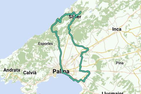 De Can Pastilla, non loin de l'aéroport de Palma, à Fonalux, par le Col de Soller. Ce magnifique village d'orangers est situé au pied de la Tramuntana. Le retour se fait par la côte via Deia et une descente rapide vers Palma par Valdemossa.