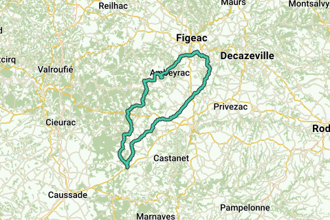 Caylus - vallée de la Bonette - Villeneuve d'Aveyron - Vallée de la Diège - St Julien d'Emparre - Vallée du Lot - Cajarc - Camp des Espagots - Caylus 128Km