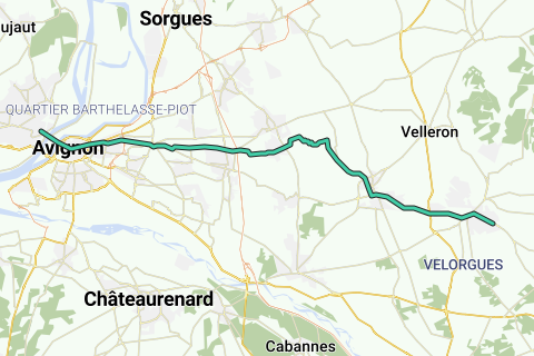 Van Camping in Avignon naar Camping La Sorguette. De camping ligt vlak naast de brug over de Rhone. Je verlaat de stad over de N100 en na een groot rond punt fiets je over de drukke baan gedurende 1 km waarna je links afslaat over een rustige weg. Er is een kleine beklimming. De rest van de route is vlak tot Isle sur la Sorgue.