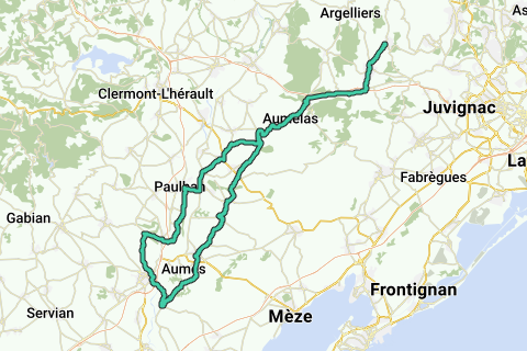 Vailhauquès, Montarnaud, St Paul, La Taillade, Aumelas, Vendémian, St Pargoire, St Pons de Mauchiens, Montagnac, Castelnau de Guers, Pézenas, route de Nizas, Lézignan la Cèbe, Cazouls d'Hérault, Usclas d'Hérault, Paulhan, Bélarga, Puilacher, Vendémian, Aumelas, La Taillade, St Paul, Montarnaud, Vailhauquès