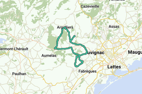 Vailhauquès, Montarnaud, Bel-Air, St Georges, Murviel, Cournonterral, Pignan, Chemin des Gardies, Murviel, St Paul, vers La Taillade, Route des Carrioles, La Boissière, Argelliers, Vailhauquès
