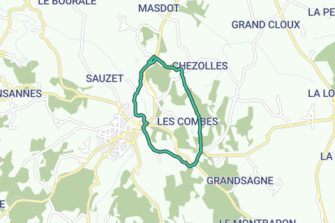 Départ depuis le Puy du Gaud. Descendre vers Bénévent tout droit par les ruelles pour contourner l’abbaye sous le mur d’enceinte. Prendre sur la droite le chemin des Chicanelles, qui descend puis remonte à la croix des Granges. Continuer sur l’ancienne route de Le Grand-Bourg pour aller traverser la nouvelle et monter par le chemin en face. (Pour aller au dolmen, vous devrez continuer 50m sur l’ancienne route avant de traverser l’actuelle D912). Au sommet, suivre sur la gauche le haut du talus sur 50m pour descendre sur la droite par le vieux chemin qui mène à la route de Chezolles. Suivre le chemin en face qui remonte à la D914. Tourner à droite sur la route pour rejoindre l’embranchement avec la D912 où vous suivrez le chemin en face de vous. A 50, monter à droite par le chemin du Puy du Gaud.